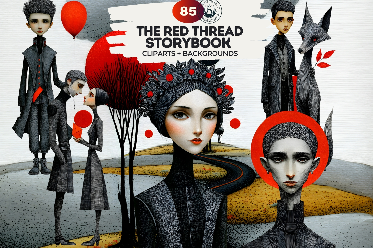 Step into a hauntingly beautiful world with this collection of 85 high-quality illustrations and backgrounds featuring striking red accents. This bundle provides 70 detailed PNG characters and animals alongside 15 atmospheric JPEG scenes in a unique, hand-drawn gothic style.