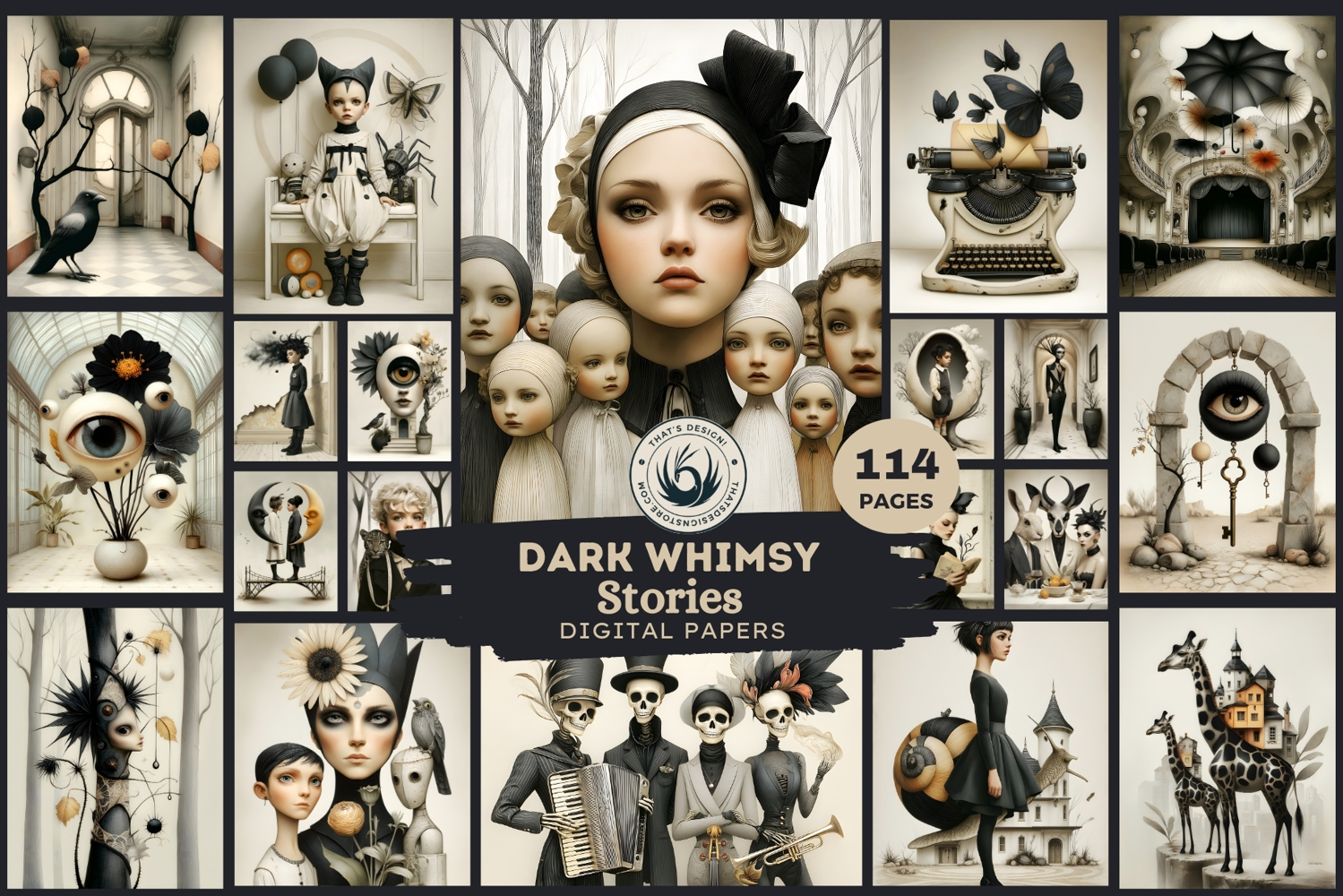 High-quality surrealist papers featuring monochromatic dark whimsical characters, gothic architecture, and dreamlike symbolic objects. This stunning fantasy collection blends vintage textures with avant-garde digital art for unique creative projects.