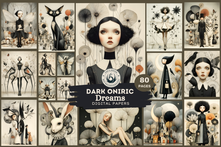 High-quality surrealist papers featuring monochromatic oniric characters, whimsical hybrid creatures, and stunning architectural dreamscapes. This fantasy collection merges gothic elegance with avant-garde digital art for truly unique creative projects.