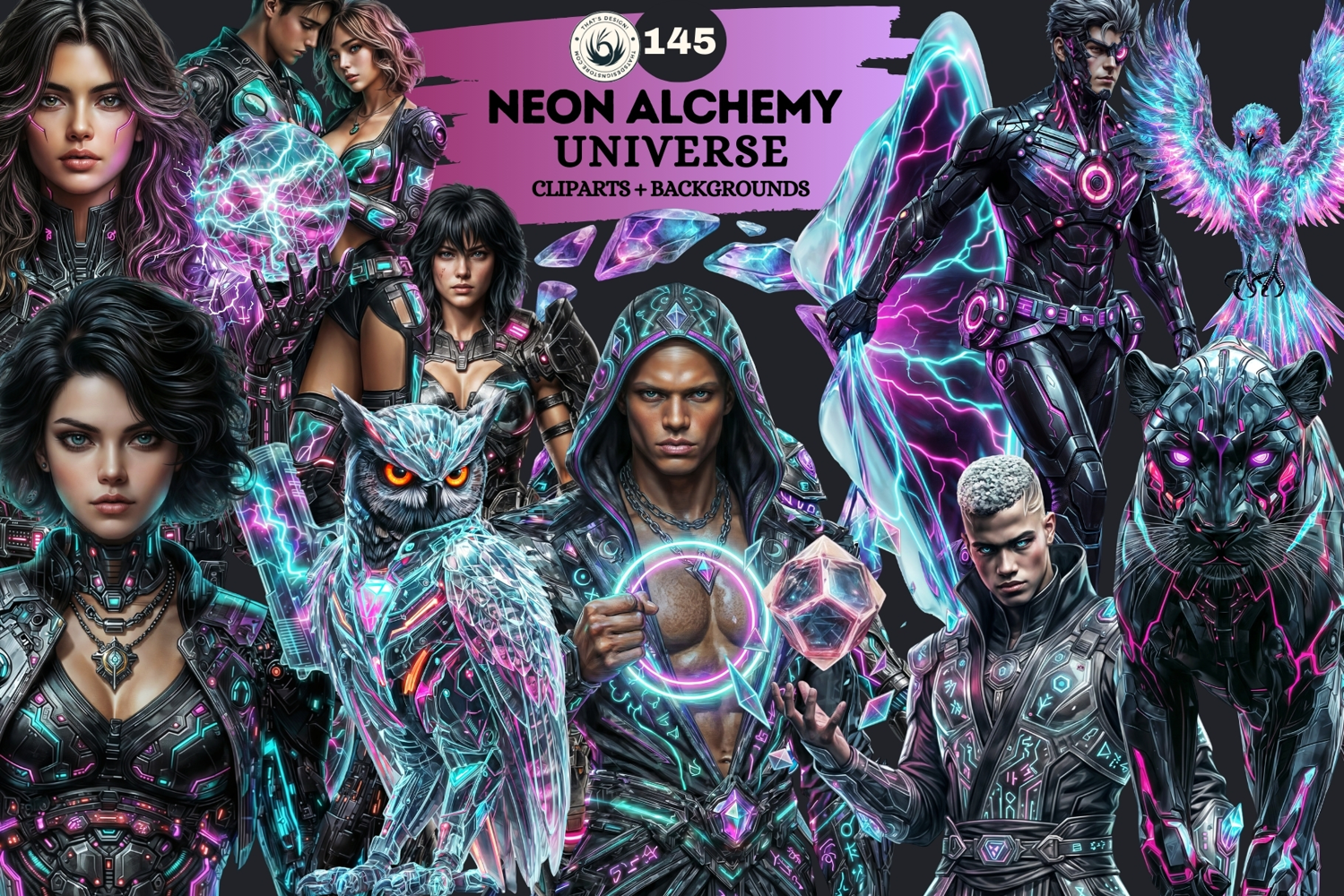 This high-quality bundle features a stunning fusion of neon-infused alchemy and futuristic sci-fi elements across detailed characters, mystical animals, and celestial landscapes. The vibrant cyberpunk aesthetic combines intricate glowing textures with dark, cinematic fantasy designs.