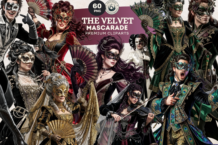 Velvet Mascarade Clipart, Fantasy Masked Characters for DIY, Cards, Journal kit, Scrapbooking, Collage, Sublimation.