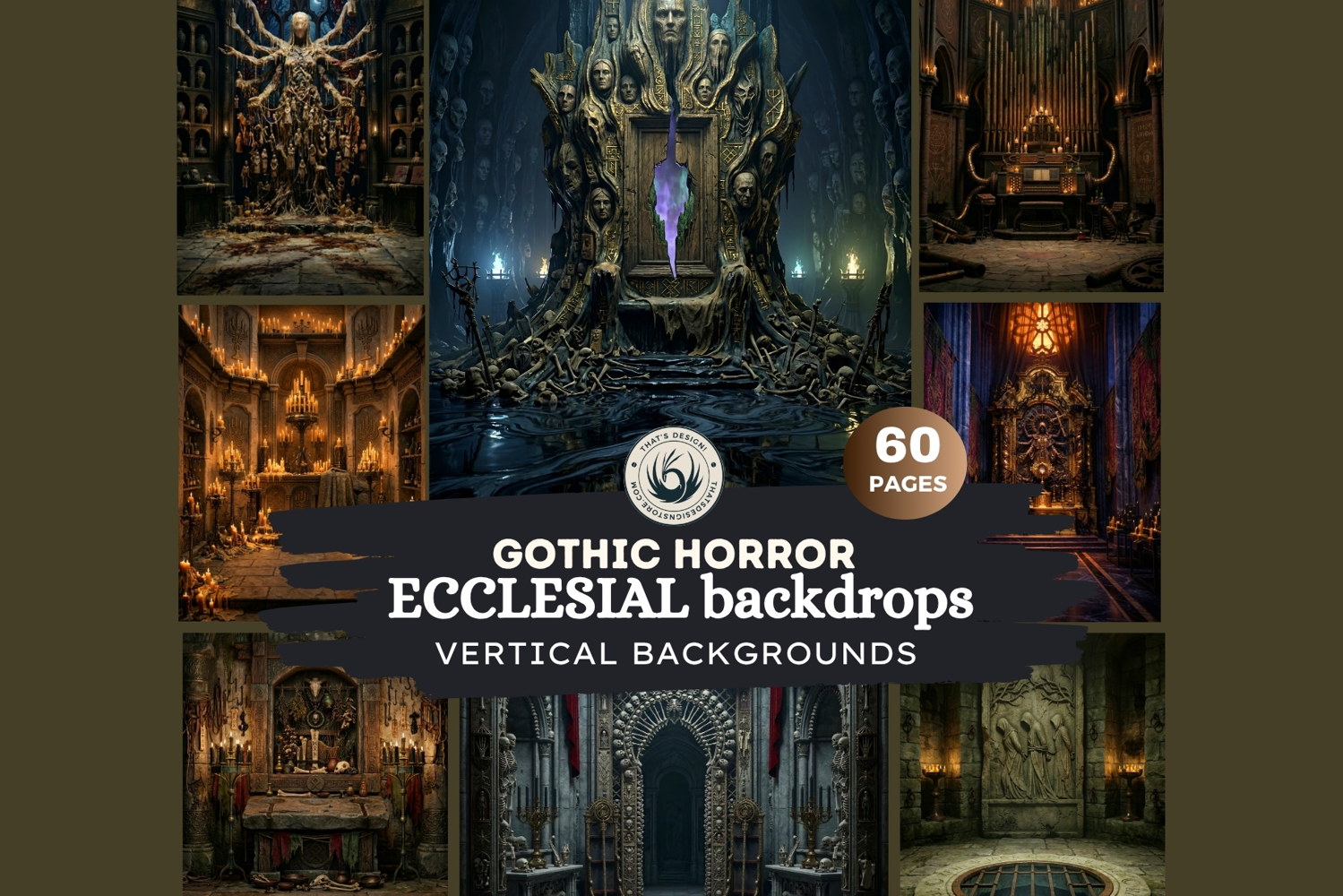 This set features high-detailed Gothic horror and ecclesial landscape backdrops, showcasing macabre catacombs, ornate altars, and sinister ritual chambers. These atmospheric designs capture a dark fantasy aesthetic with deep shadows, candlelight, and intricate architectural textures.