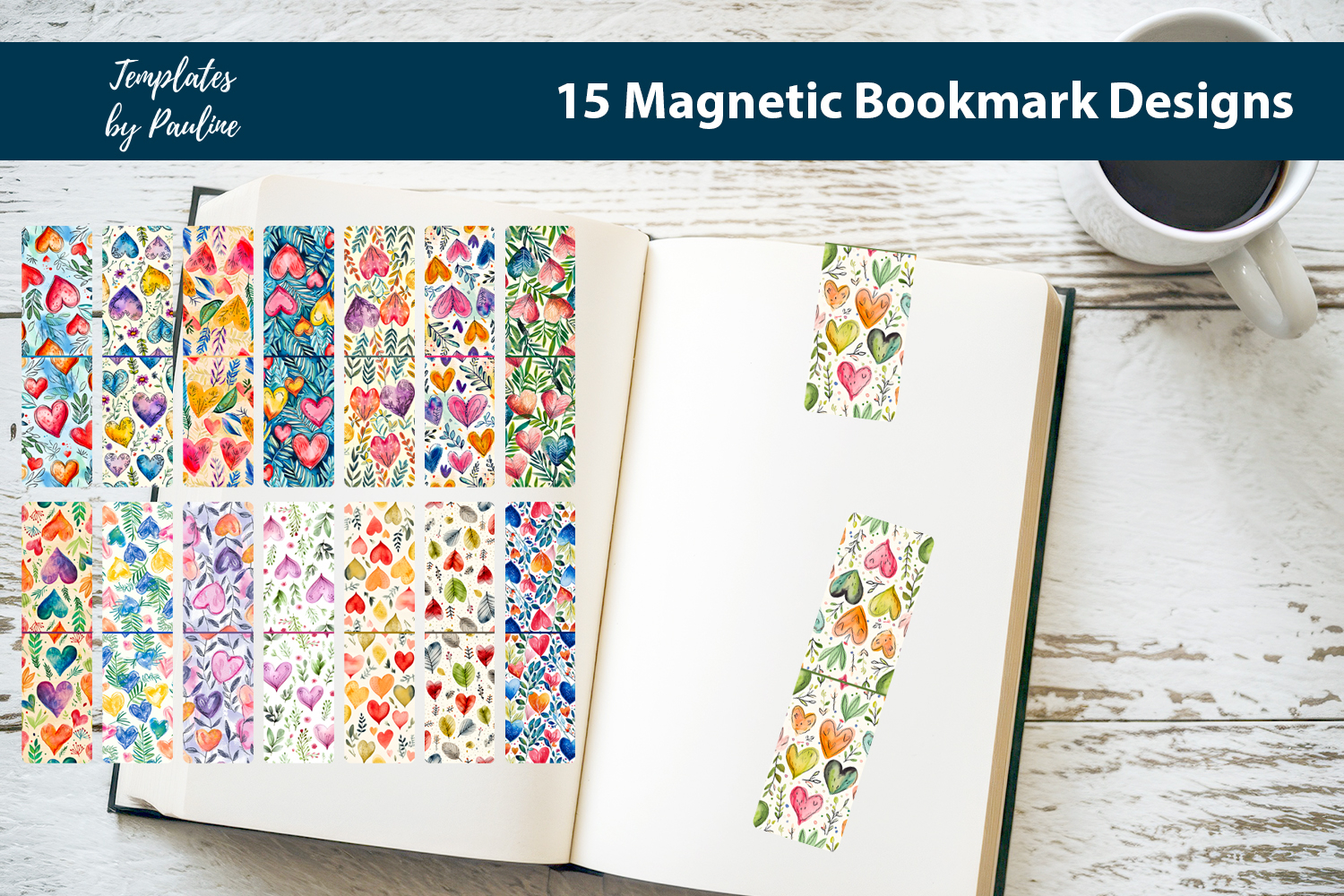 This colorful pattern featuring hearts and leaves creates a joyful ambiance to DIY magnetic bookmarks.