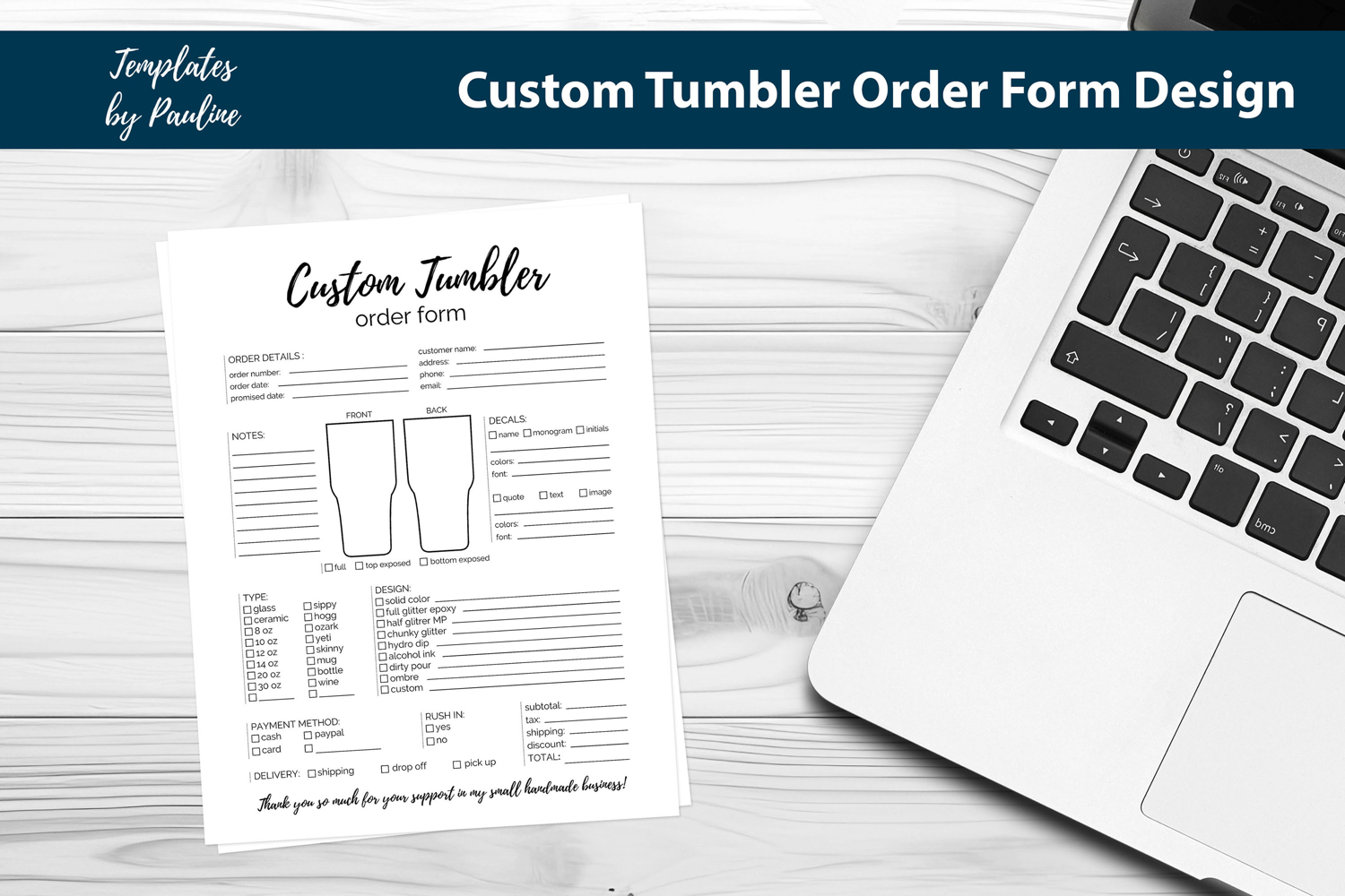 Printable custom tumbler order form for vinyl and sublimation cup sellers. You receive a non-editable Letter-size order form suitable for home print or a print shop.