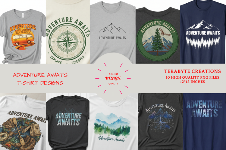 Unleash your adventurous spirit with our "ADVENTURE AWAITS T-SHIRT DESIGNS " digital T-shirt design collection! This versatile graphic art file is perfect for creators, and anyone looking to create custom apparel that inspires a love for the great outdoors.
