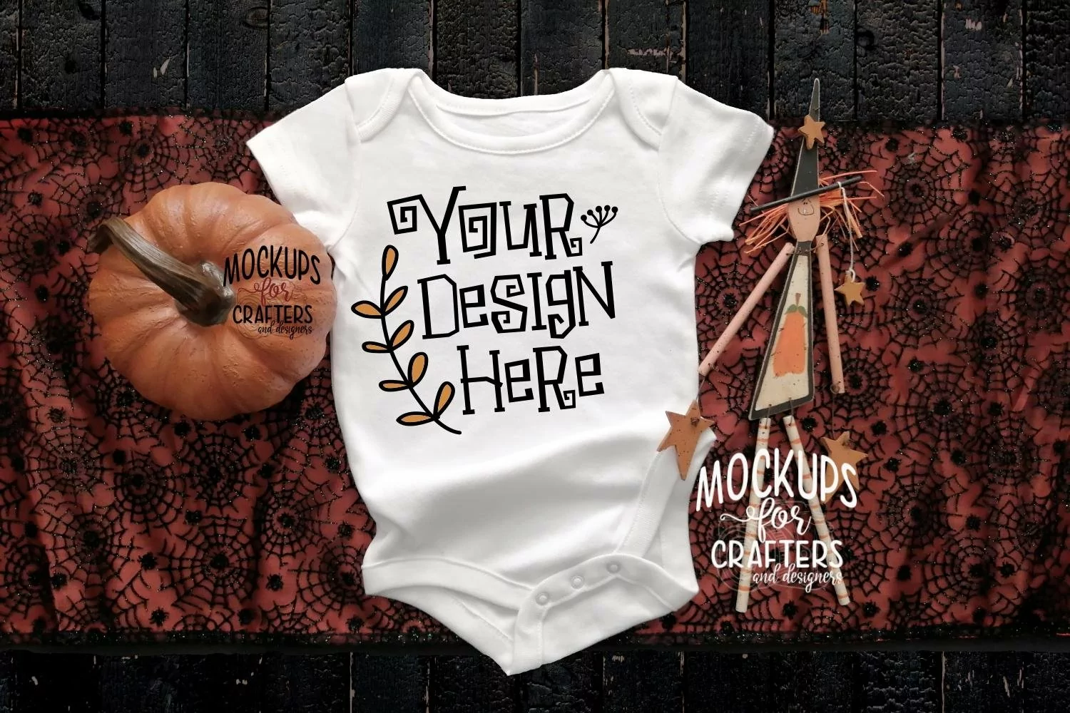 White one piece baby bodysuit - Halloween theme with witch and pumpkin. Your purchase will include a high quality flattened JPEG file (text/logo/watermark free)