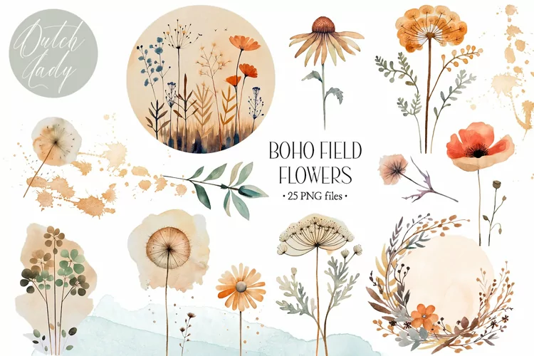 Watercolor Field Flower Clipart Set - 25 .PNG Files