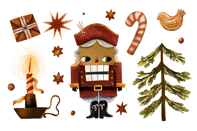 Christmas Nutcracker Cartoon Illustration. Wooden Soldier Toy Nutcracker. Nutcracker Christmas Set. New Year Soldier toy. December Ballet Party. Creative Merry Xmas Design. Happy New Year. Winter Holidays. Hand drawn illustration in Watercolor Style. Christmas.  Hand Drawn Watercolor Cartoon Illustration