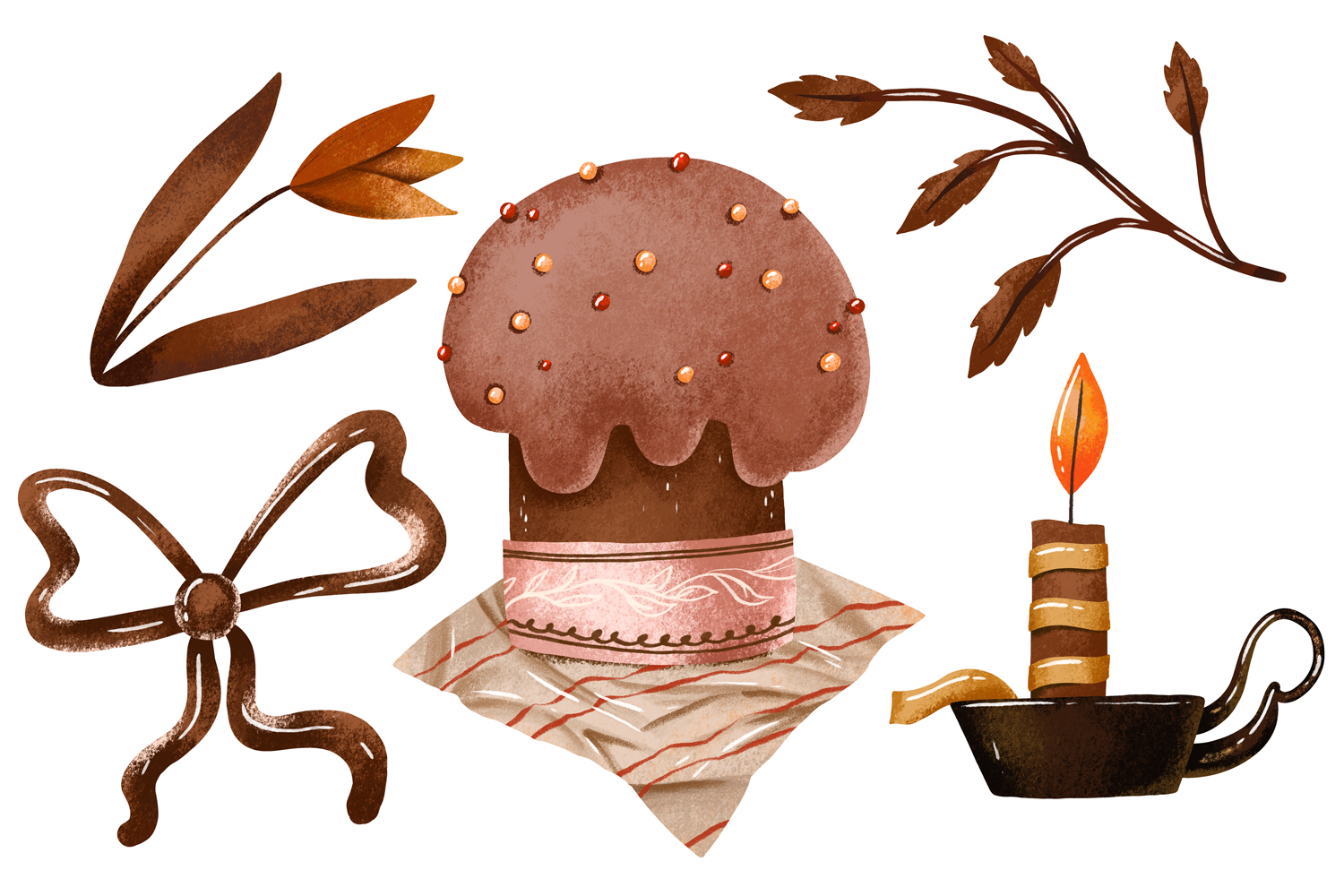 Happy Easter Hand Drawn Cartoon Illustration with Festive Cake, Tulip, Candle, Bow, Branch. Spring Holidays. Hand Drawn Watercolor Cartoon Illustration