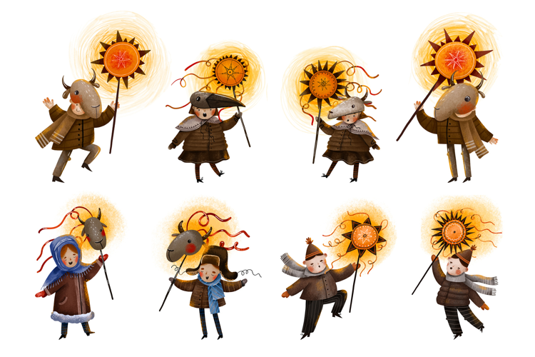 Ukrainian Carolers with Christmas Star. Ukrainian Kids Celebrate Christmas. Ukraine Slavic Traditions. Malanka, Carols. Ukraine Kids Singing of Christmas Carols. Holiday Christmas Goat Mask in Traditional Ukrainian Costume and Religion Star in the Hand. Hand Drawn Watercolor Cartoon Illustration