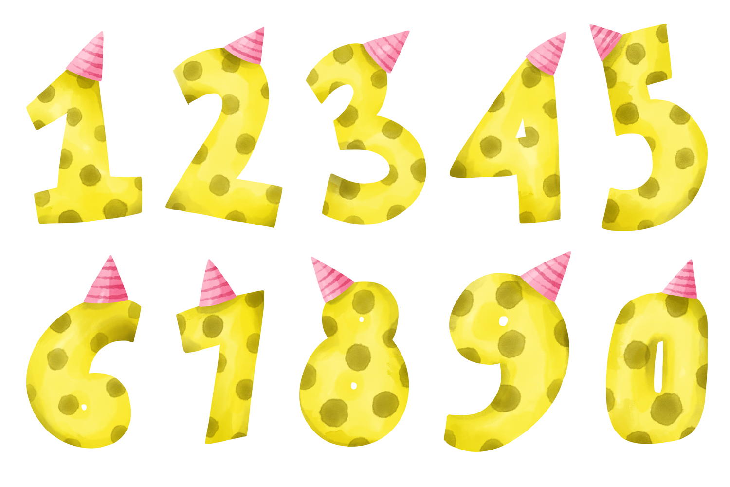 A bright and playful set of watercolor numbers designed as birthday candles with cheerful yellow polka dot texture and cute party hats. The collection includes all 10 digits from 0 to 9, created in high resolution 300 DPI for crisp printing and professional-quality digital use. Each element comes in PNG format with transparent background as well as JPG, making it easy to use in any project.