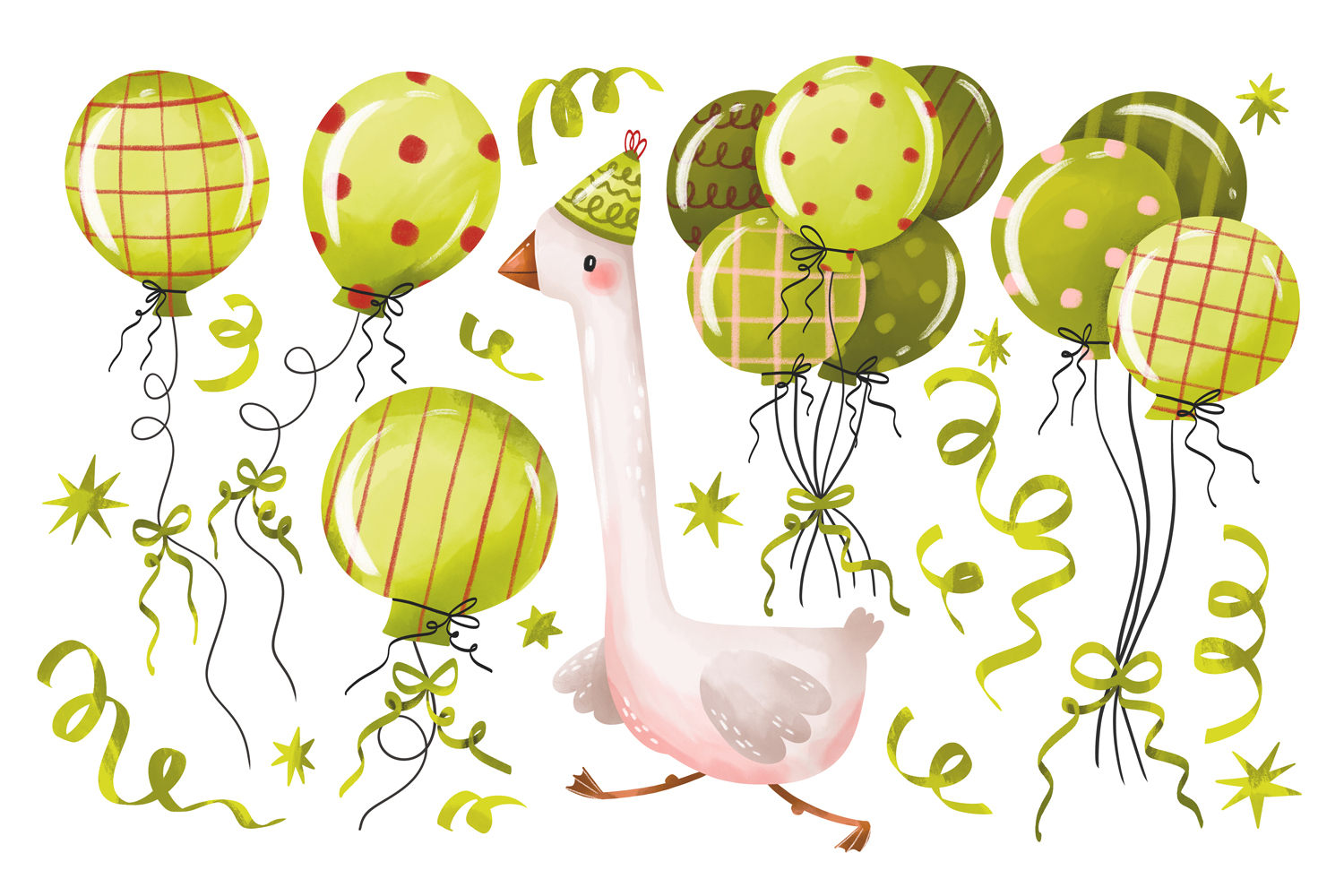 The set includes 26 elements in total, consisting of 1 goose, 5 balloons, and 16 decorative elements like ribbons, bows, stars, and confetti accents. All elements are carefully isolated and designed to work together гармонично, allowing easy creation of cohesive birthday compositions. The fresh green color palette with soft warm tones makes this collection perfect for modern and playful kids designs.