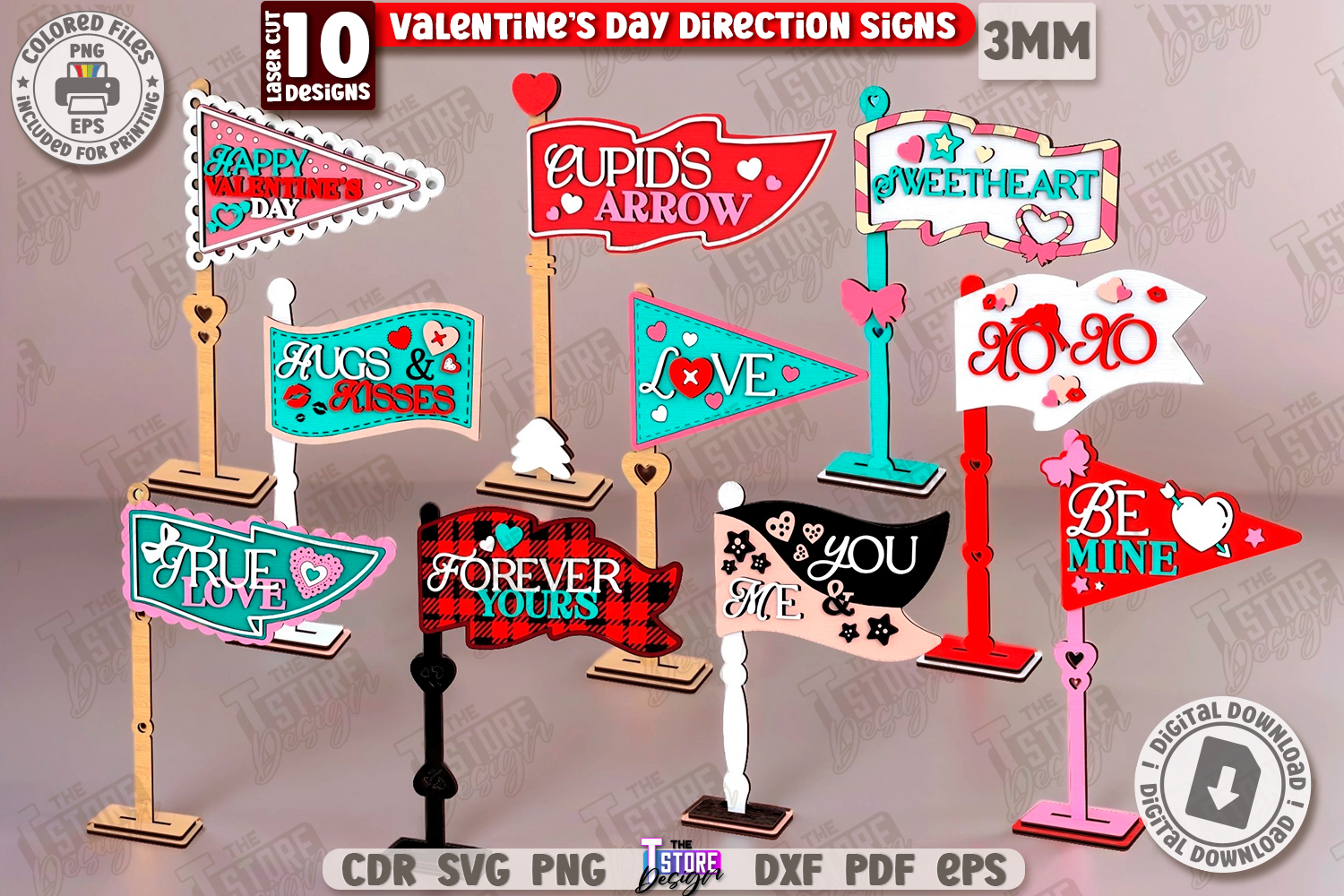 Valentine’s Day Direction Signs Laser Cut Bundle | Romantic Décor | Mini Flags | Gift Idea Laser Cut | Wooden Stands | Heart Motifs | Love Messages | Tabletop Decorations | CNC Files