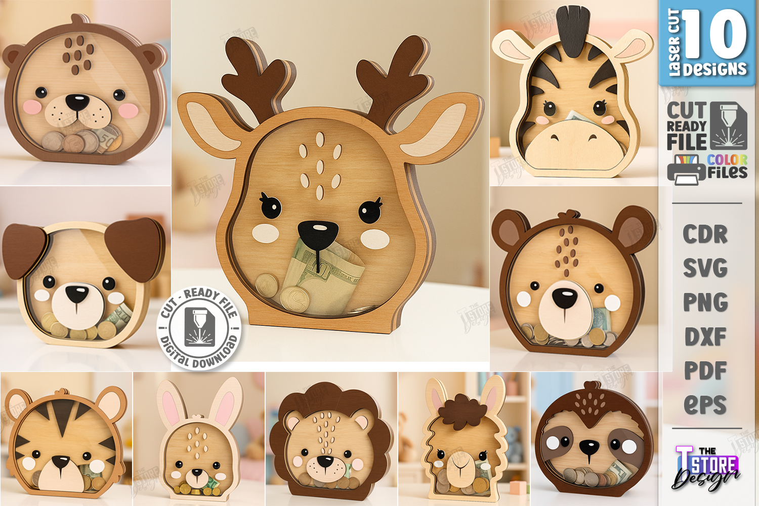 Animal Money Boxes Laser Cut Bundle | Cute Animal Design | Coin Boxes | Wooden Piggy Bank | Kids Money Boxes | Animal Coin Bank | CNC Files