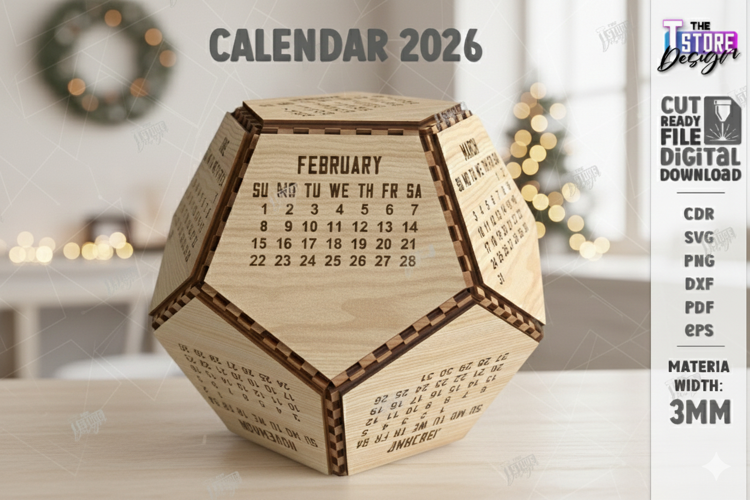 Calendar 2026 Laser Cut Design | Dodecahedron Calendar | New Year | Desk Calendar | Office Decor | Gift Idea | Home Decor | Modern Design | Rusic SVG | Christmas Gift | Craft | Calendar Idea | CNC File