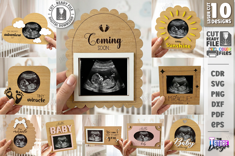 Baby Scan Ultrasound Frames Laser Cut Bundle | Pregnancy Announcement Wood Designs | Sonogram Photo Holder Laser Cut File | Coming Soon | Baby Shower Gift DXF | Nursery Decor | Personalized Wood Picture Frame | 3mm Plywood Pregnancy Keepsake Laser Ready | New Baby Reveal Ornament Digital Download | CNC Files
