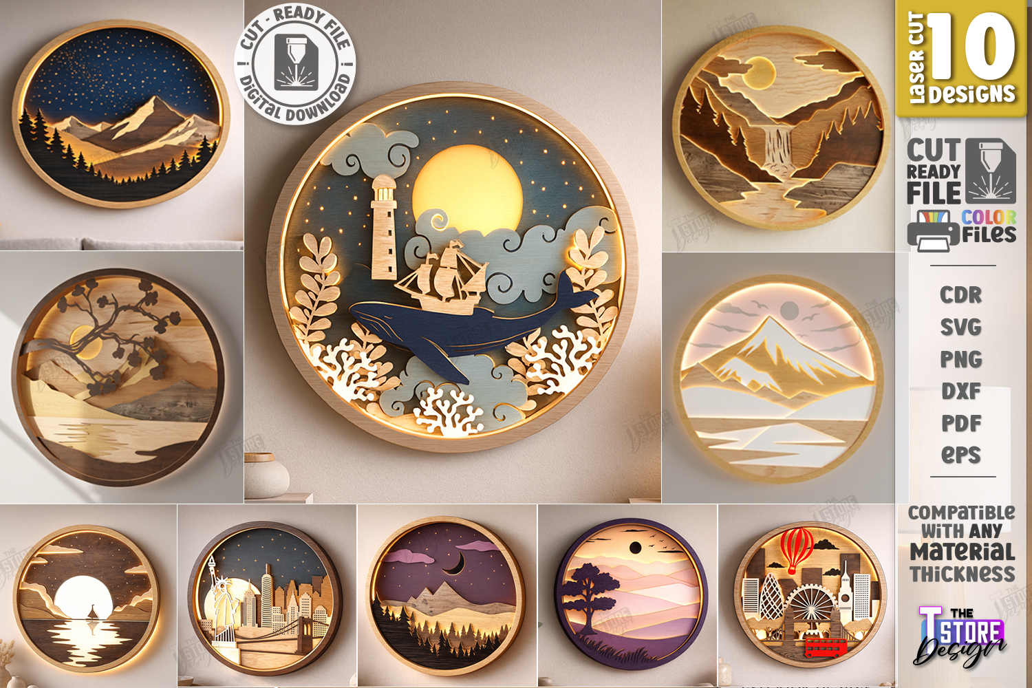 3D Layered Wall Art Laser Cut Bundle | Circular Nature Landscape SVG | Multi Layer Shadow Box Designs | Wooden Round Scenic Decor | Glowforge Files | Modern Home Interior Art | Circular 3D Layered Vector Templates for Laser Cutting | DIY Scenic Wall Hanging Project | Digital Download | CNC Files