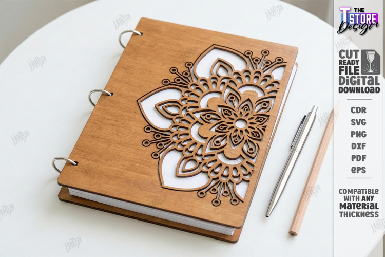 Wooden Notebook Cover Laser Cut | Floral and Geometric Planner Designs | Planner - Notebook Cover | Laser Ready Wood Binder Files | DIY Stationery Gift DXF SVG PDF | Decorative Spiral Notebook Template | Glowforge Cut Files | Mandala SVG | CNC File