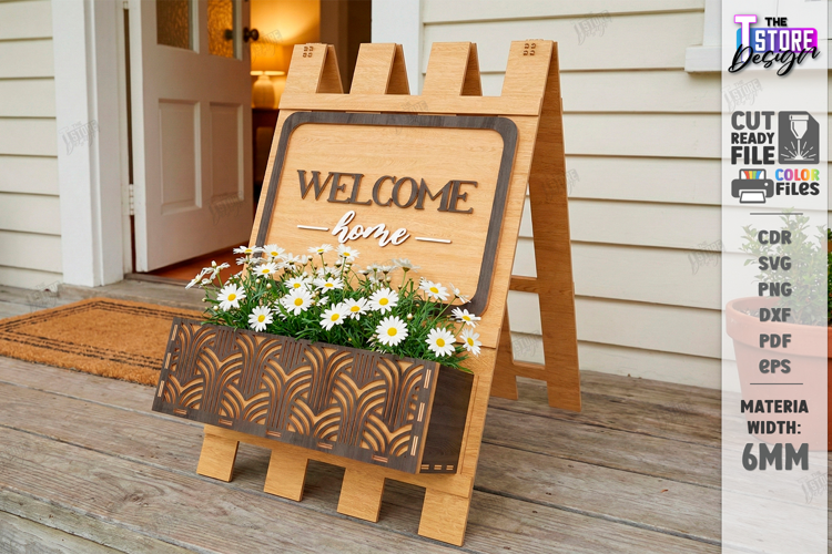 A-Frame Welcome Sign Laser Cut Files | Standing Flower Planter Box SVG | Outdoor Wedding and Garden Decor Glowforge Svg 3D Standing Porch Sign with Flower Pot | Home Sweet Home Welcome Sign Laser File | Wedding Welcome Signage for Laser Cutting Garden Welcome Sign SVG DXF | Designs Welcome Signs | Decorative Flower Box Planter Laser Cut Pattern 6mm