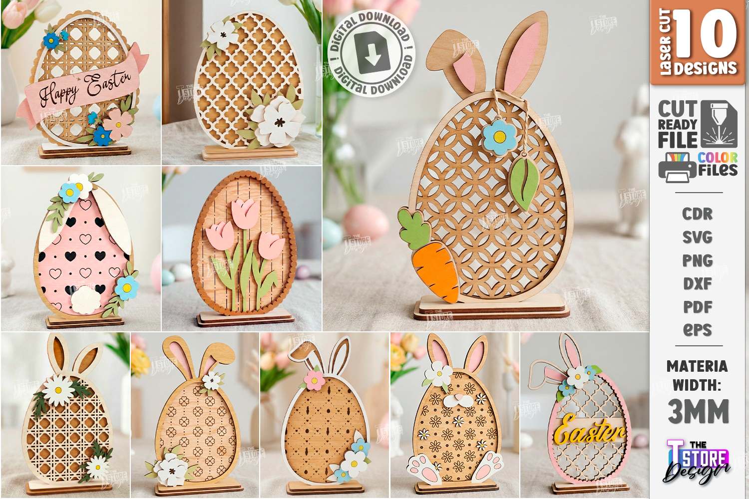 Easter Egg Shelf Sitter Laser Cut Bundle | Floral and Bunny | Happy Easter Table Decor Glowforge Files | Spring Patterned Egg Stand Signs | Lattice and Tulip Wooden Ornaments | 3mm Wood Easter Egg Laser Ready | Digital Download DXF PDF EPS