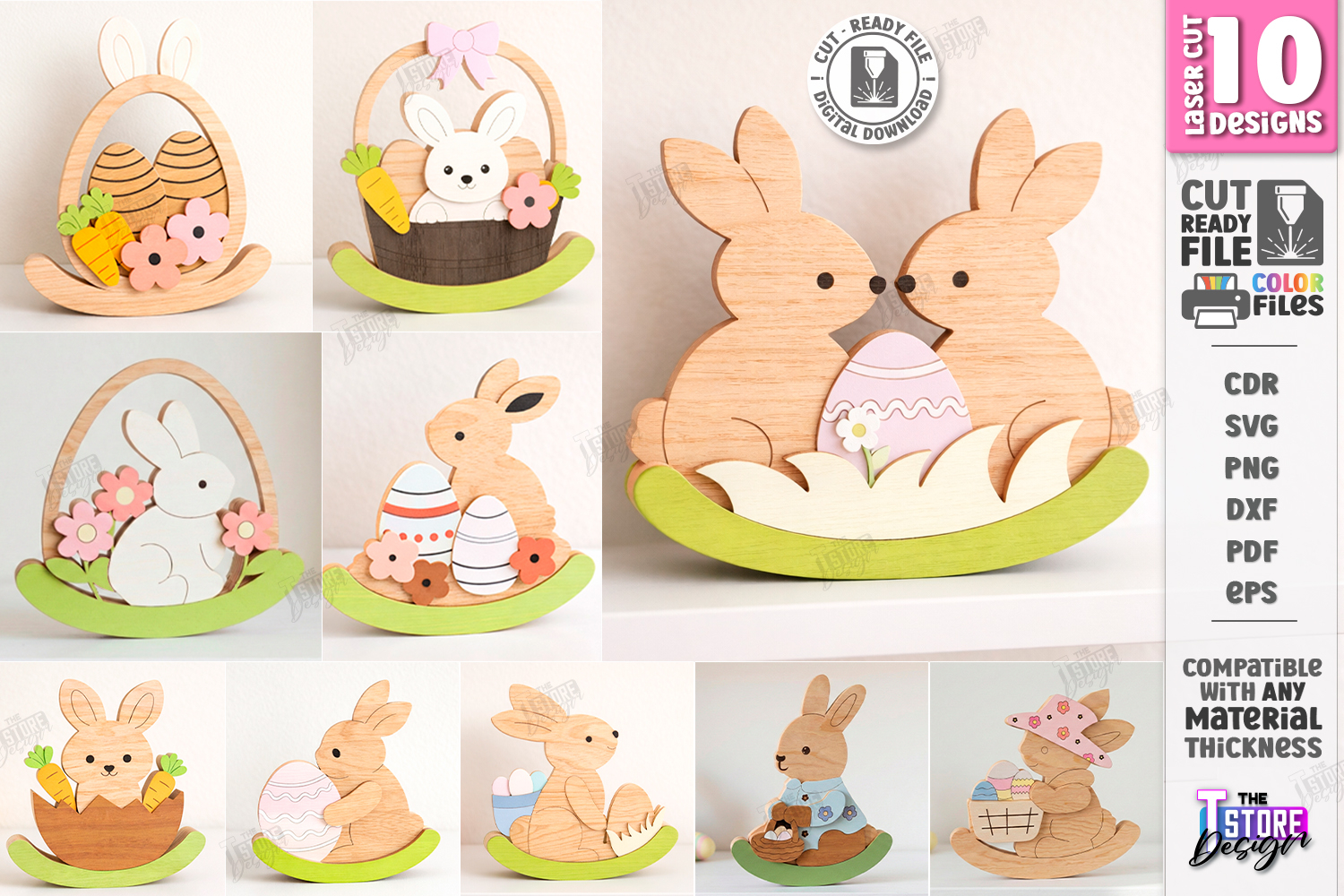 Easter Bunny Rocker Laser Cut Bundle | 3D Laser Cut Rabbit Decor SVG | Layered Easter Egg Rocking Toy | Cute Bunny Basket Glowforge File | Kids Tabletop Easter Decoration | Spring Animal Nursery Decor | Set of 10 Rocking Bunny Designs | Plywood Easter Craft | Easter Shelf Sitter | CNC Files