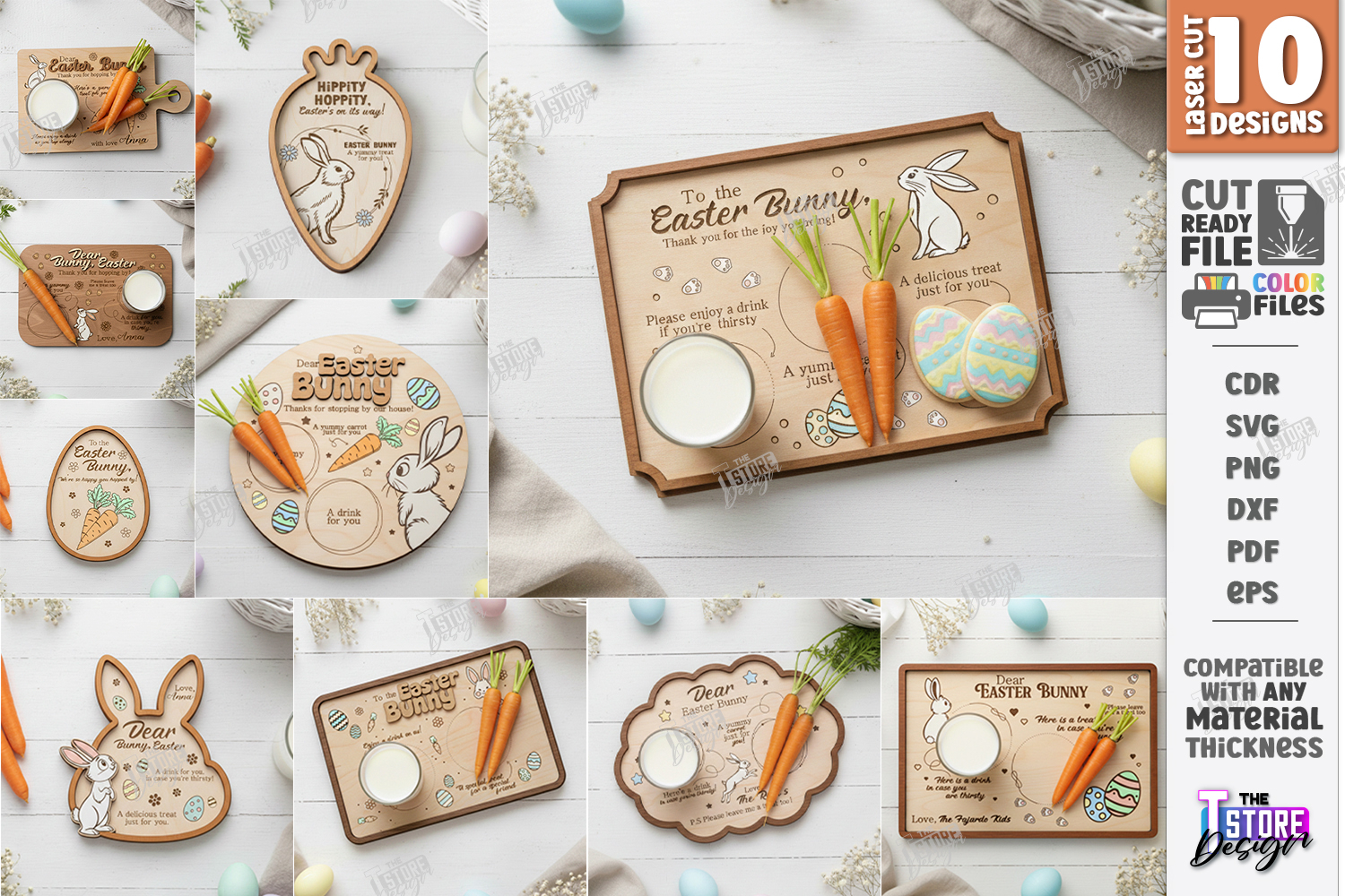 Easter Bunny Treat Tray Laser Cut Bundle | Personalized Carrot and Milk Plate Designs | Dear Easter Bunny Board SVG | Spring Wood Serving Trays | Glowforge Ready Cut Files | Easter Eve Tradition Boards | Rabbit Snack Plate SVG | Digital Download for Laser Engraving | CNC Files