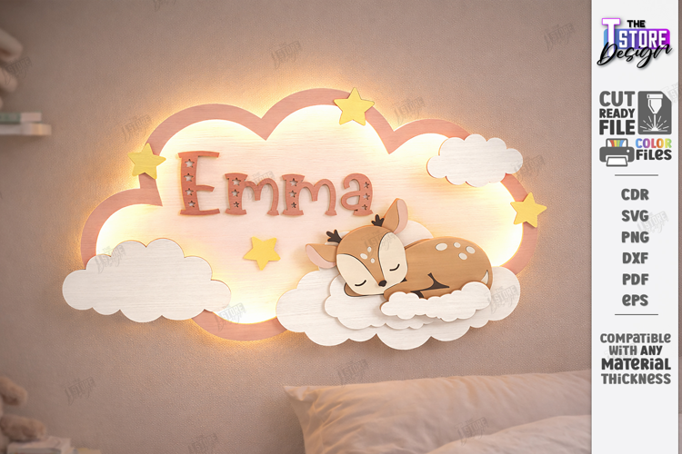 Create a beautiful personalized cloud night light with custom baby name using this layered laser cut SVG design. Perfect for 3mm plywood, LED backlight projects, nursery wall decor, baby shower gifts and newborn room styling. Compatible with Glowforge, CNC and laser cutting machines