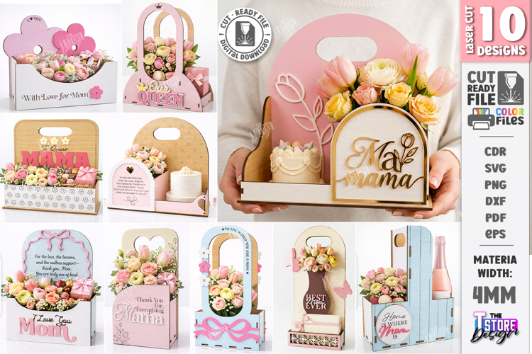 10 Mother's Day Flower Holder Laser Cut Bundle | Mother's Day Laser | Gift Idea | Wooden Gift Basket Laser Cut Files | Personalized Mom Floral Carrier SVG | Best Mom Ever Gift Box Laser File | Bento Box SVG | Mother's Day Bouquet Stand | Custom Mama Flower Box CNC | 4mm Plywood Floral Basket | Mother's Day Gift Hamper SVG | Flower Arrangement Holder Bundle | Grandmother Gift | Cake Gift Laser | CNC Files