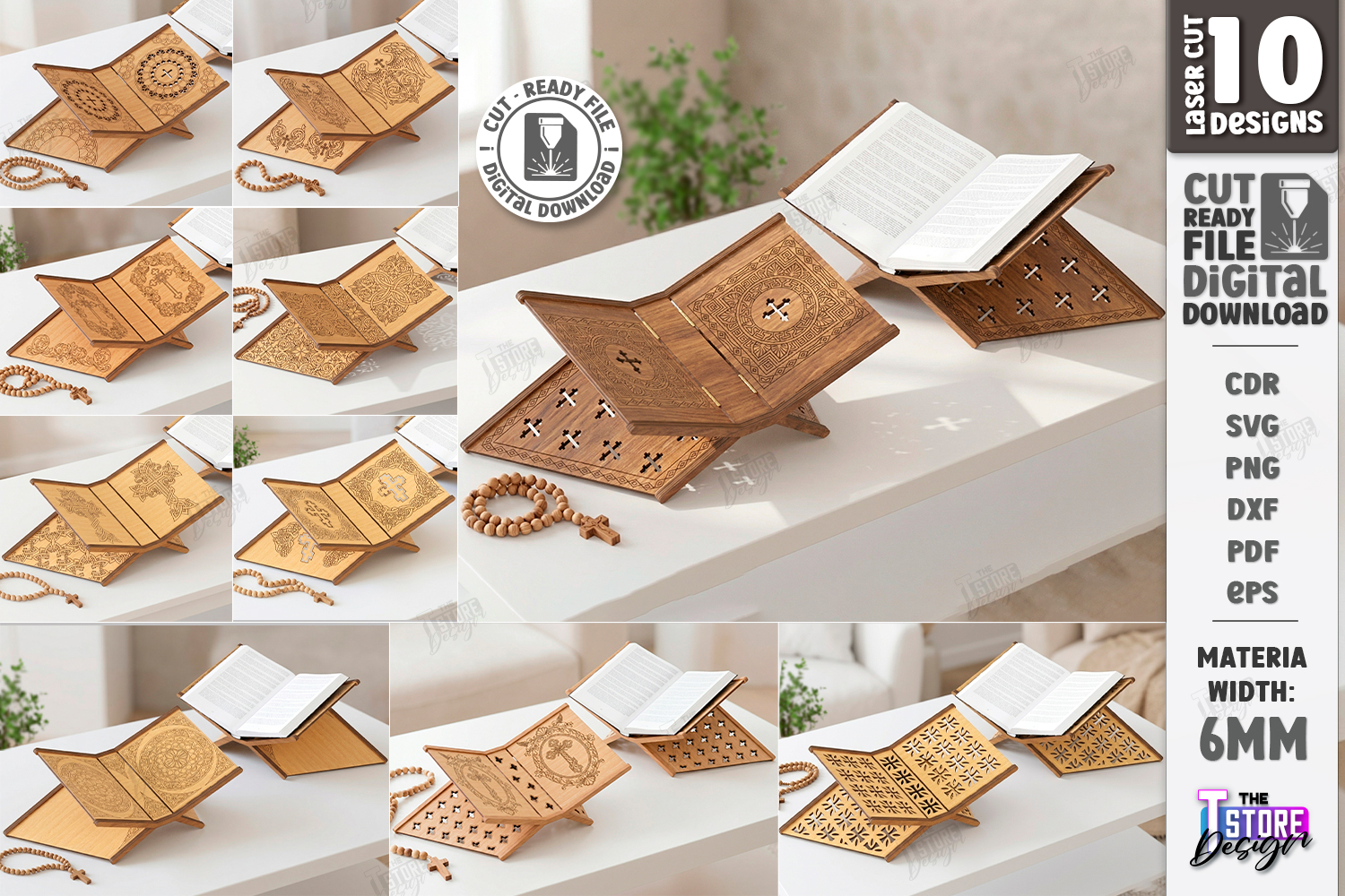 Bible Stand Laser Cut Bundle | Wooden Quran Holder SVG | Religious Book Stand Glowforge File | Rehal Foldable Lectern DXF | Ornate Church Cross Design | Prayer Book Rest Vector | 10 Decorative Laser Ready Templates | CNC File