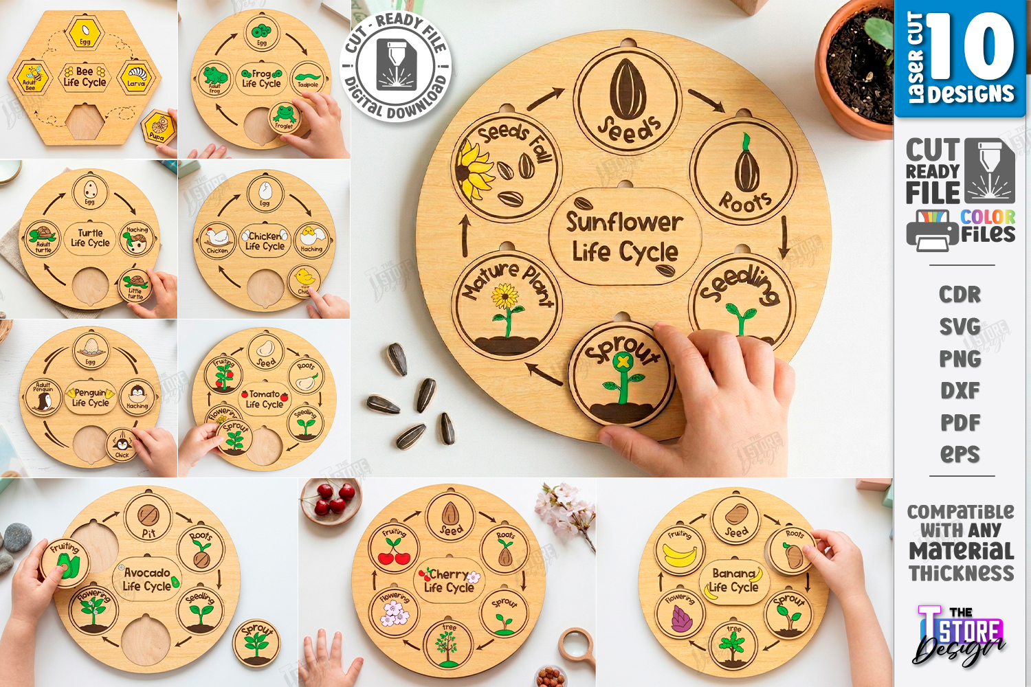 Life Cycle Puzzle Laser Cut Bundle | Montessori Educational Toy Laser Cut Files | Nature Learning Board Glowforge Plans | Science Biology CNC Pattern | Sunflower and Bee Life Cycle Template | Classroom Homeschool Decor | Plywood Activity Board Digital Download | Toddler Learning Game Design | CNC Files