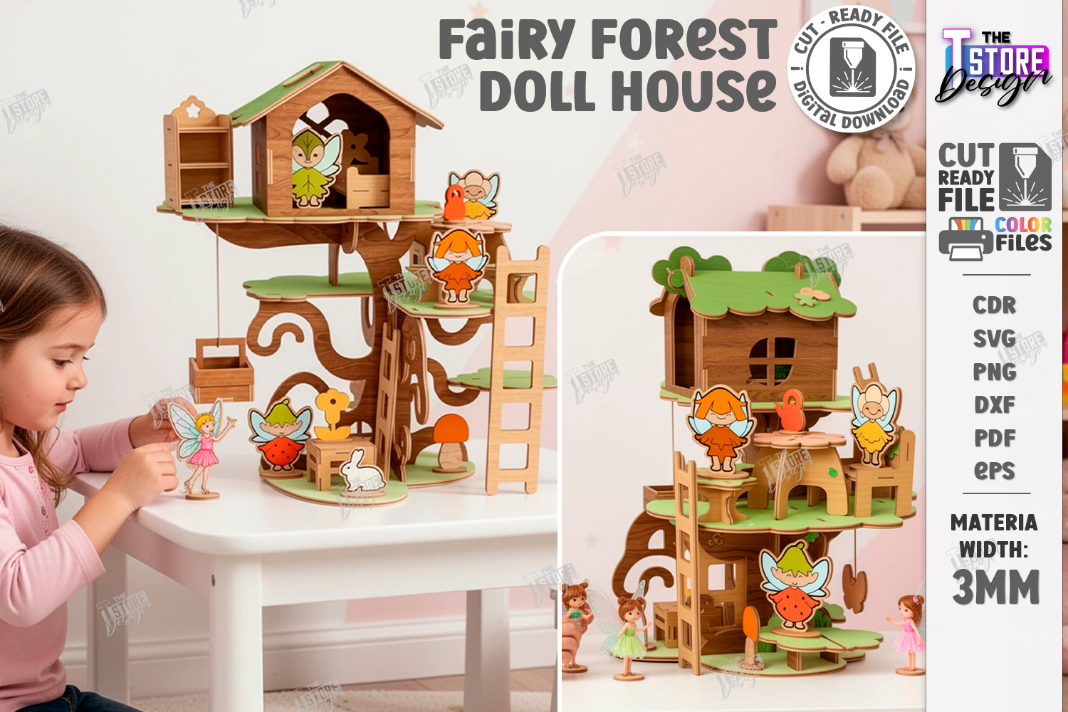 Fairy Forest Doll House Laser Cut Files | Treehouse Toy Shelf Design | Magical Woods Playhouse for Kids | Laser Ready Dollhouse Miniature | Enchanted Forest Nursery Decor | Childrens Pretend Play Set | DIY Wooden Toy House | 3mm Plywood Laser Project | Fantasy Tree House Craft | Waldorf and Montessori Inspired Toy