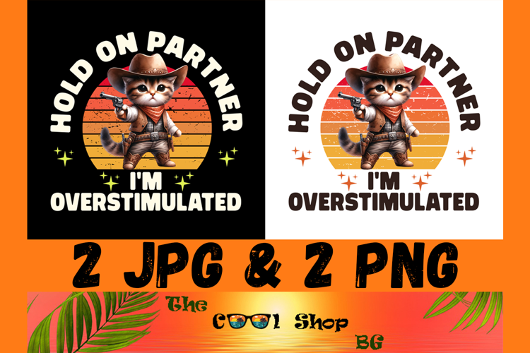 Add some humor to your day with our "Hold On Partner, I'm Overstimulated" Cat PNG/JPG, featuring a funny cowboy cat. Perfect for meme lovers and cat enthusiasts, this playful design makes a great gift for anyone who enjoys quirky animal humor.