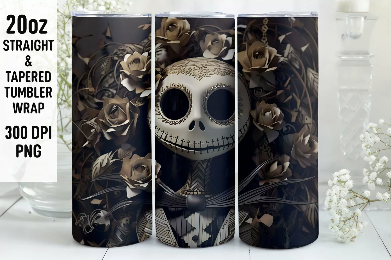 This listing contains 3D Halloween Tumbler Sublimation wraps that have been AI-generated, edited, and enhanced with Photoshop and saved in the following format: