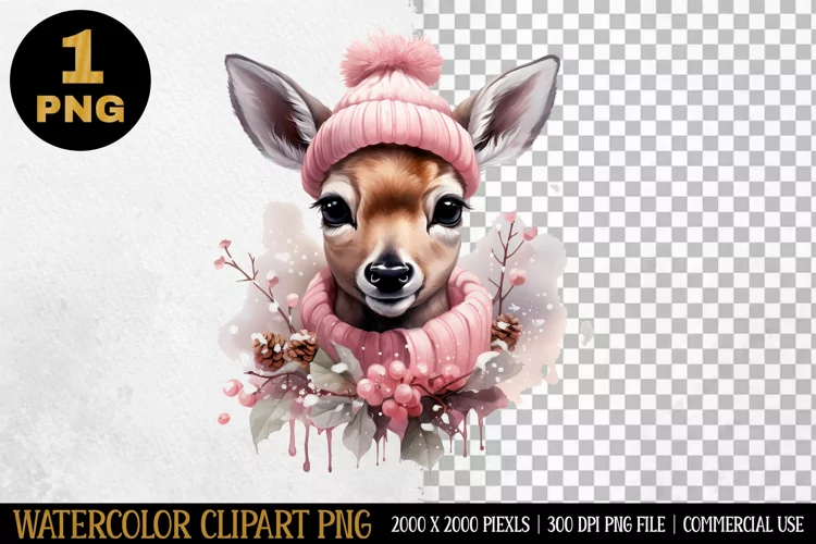 Reindeer in Hat Watercolor Clipart | Sublimation Designs PNG example image 1