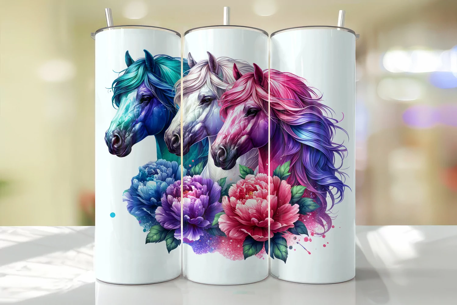 Colorful Horses with Florals Tumbler Wrap Sublimation Design
