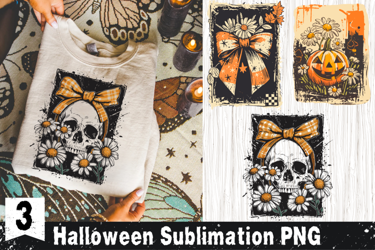 Halloween Sublimation Skull Floral Png Halloween T-shirt Png Fall Ghost Design Orange Bow Clipart Gothic Floral Print Grunge Halloween Png Vintage Pumpkin Skull Witch Hat Ghost Design Spooky Daisy Illustration