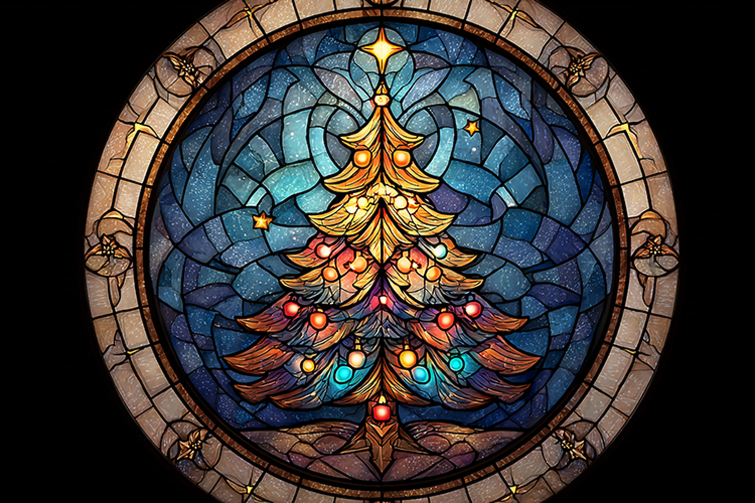 This image features a stunning stained glass window showcasing a Christmas tree, crafted with intricate patterns and vibrant colors. The circular window is set against a black background, highlighting the beauty of the stained glass artwork. The Christmas tree is adorned with ornaments and lights, creating a festive and joyful atmosphere.