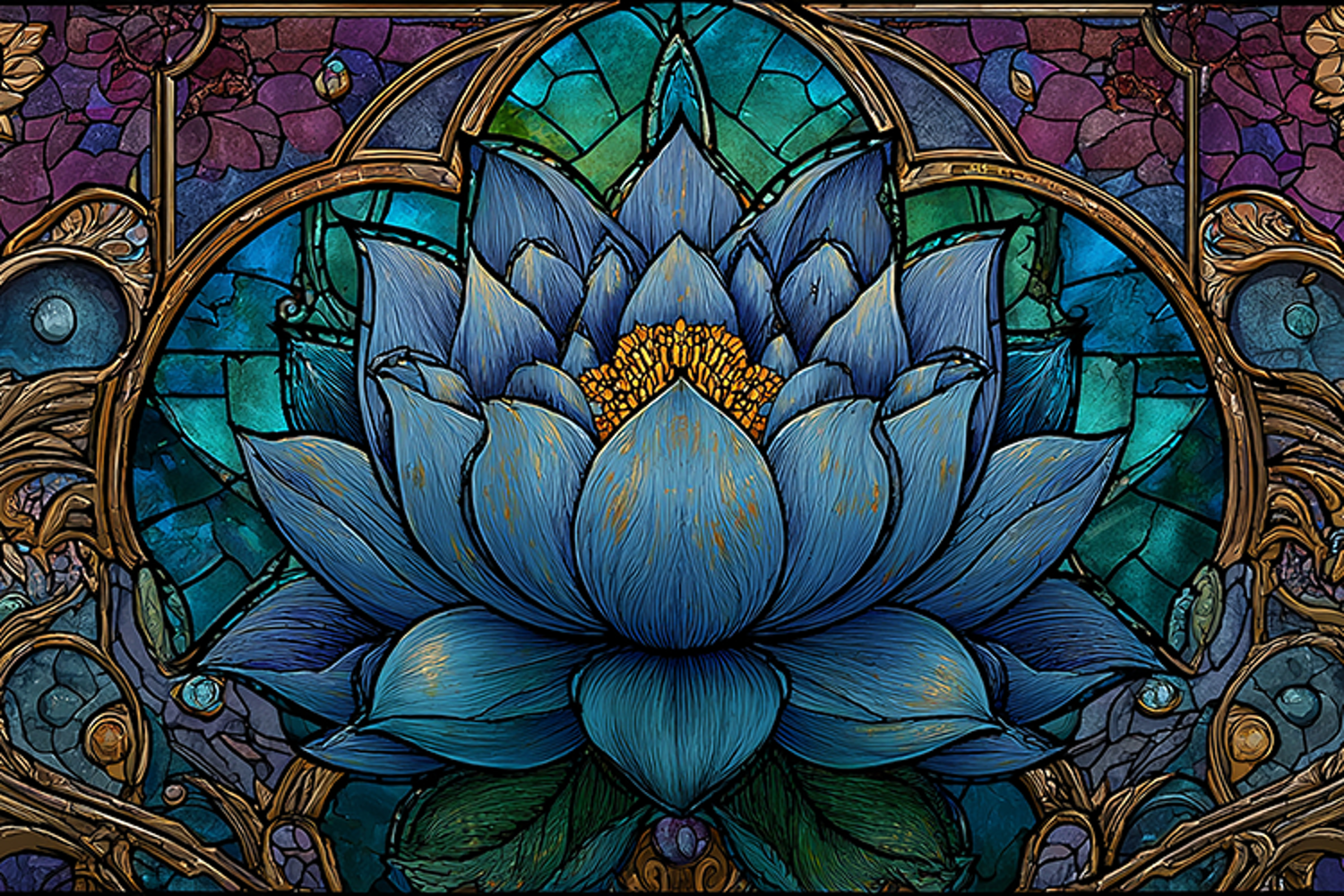 This stunning stained glass artwork features a beautiful blue lotus flower as its centerpiece, surrounded by intricate gold details and a kaleidoscope of colors. The lotus flower is often a symbol of peace and serenity, and this piece embodies those qualities with its vibrant yet calming presence. The stained glass technique used here creates a sense of depth and dimensionality, making the artwork truly eye-catching.