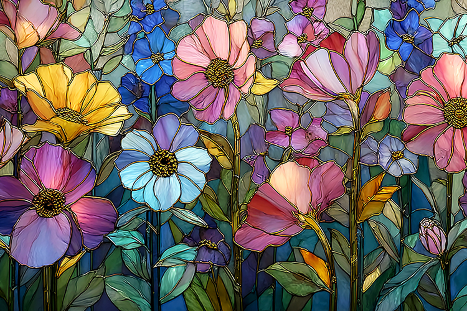 A vibrant stained glass artwork of colorful flowers