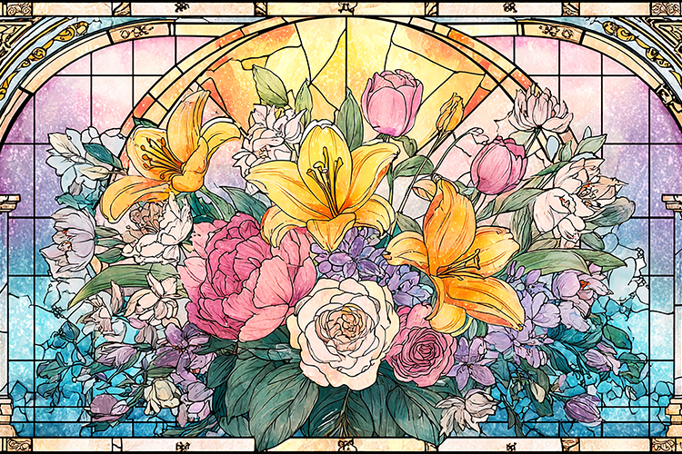 This stunning stained glass window features a vibrant floral arrangement in shades of pink, yellow, white, and purple. The intricate design and beautiful craftsmanship make it a work of art, perfect for adding a touch of elegance and luxury to any room. The serene and peaceful atmosphere it creates makes it a great addition to any interior space.