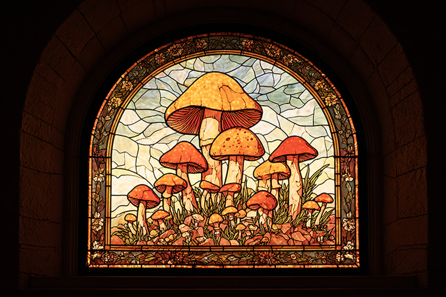 A stained glass window depicting colorful mushrooms