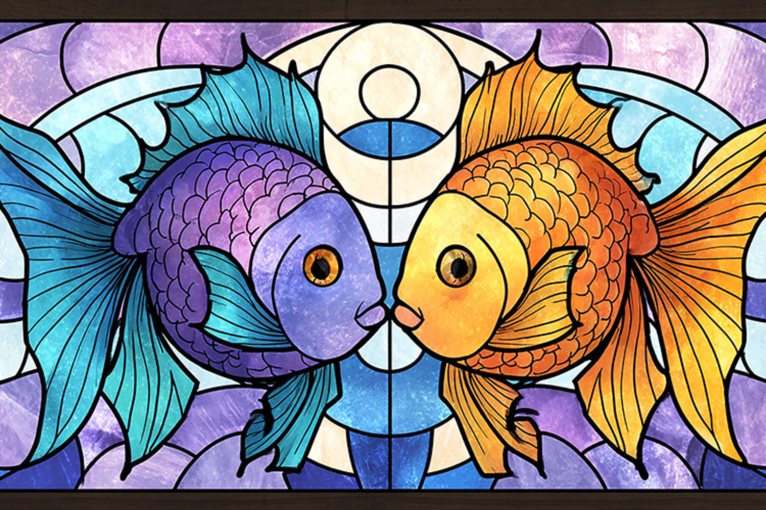 This is a stunning stained glass artwork featuring two fish in shades of purple, blue, orange, and yellow. The intricate design and vibrant colors create a beautiful and peaceful piece of art that can add a touch of elegance to any room. The stained glass technique used in this artwork creates a sense of depth and dimensionality, making it a unique and eye-catching piece.
