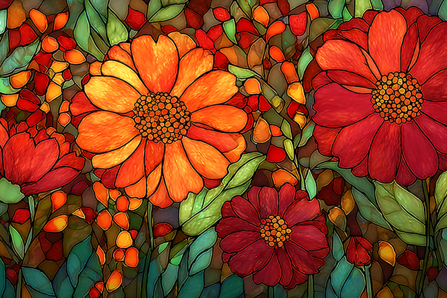 A vibrant stained glass artwork of colorful flowers