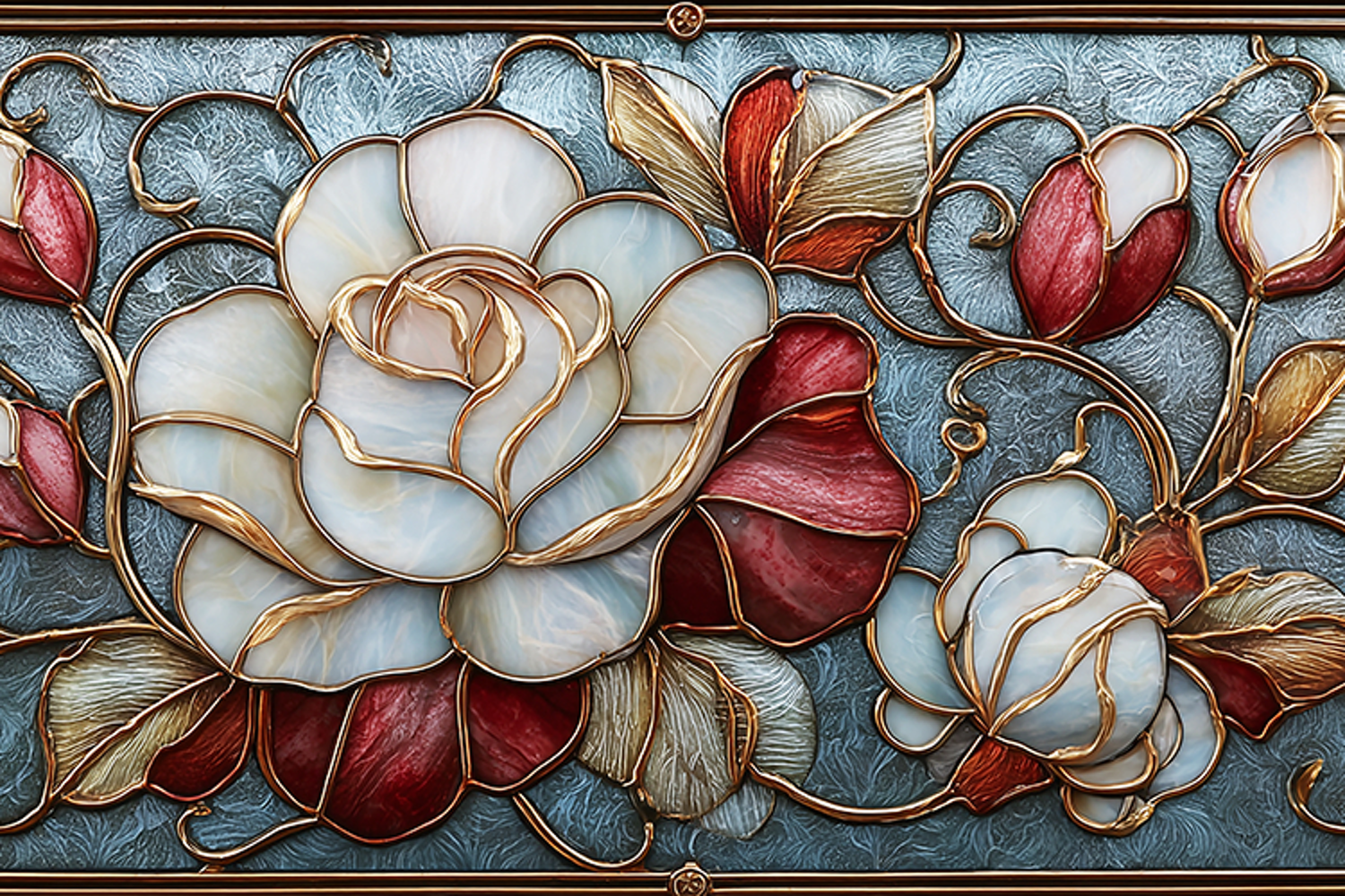 A stunning stained glass artwork featuring a large white flower with red and gold leaves and stems, set against a blue background with a textured pattern, showcasing intricate design and craftsmanship.