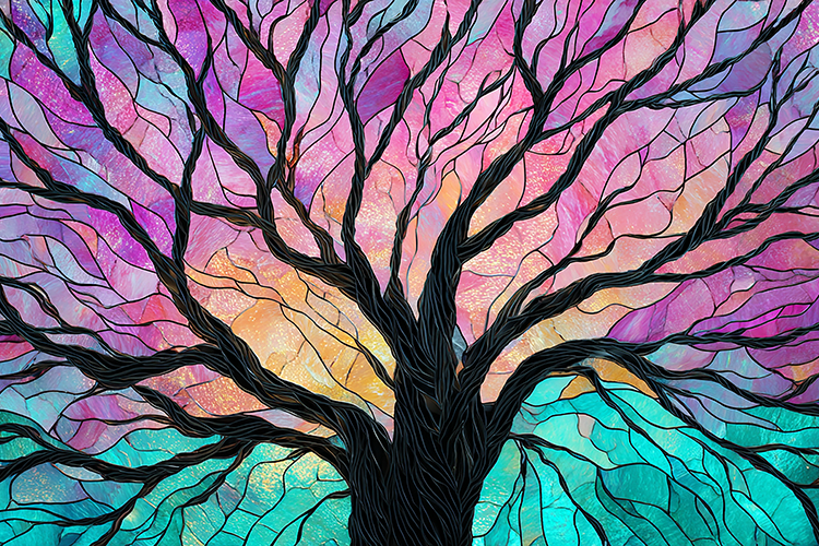 A stunning abstract illustration of a tree with vibrant branches set against a colorful background, evoking a sense of peace and serenity. The image features a unique blend of pink, purple, blue, and teal hues, creating a beautiful and dramatic visual effect.