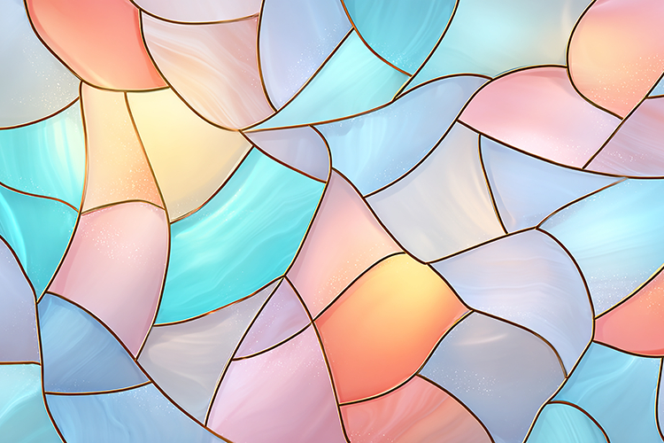 This image features a vibrant and colorful abstract stained glass pattern, characterized by swirling geometric shapes in pastel hues. The design is modern, artistic, and visually appealing, with smooth curved lines and intricate details.
