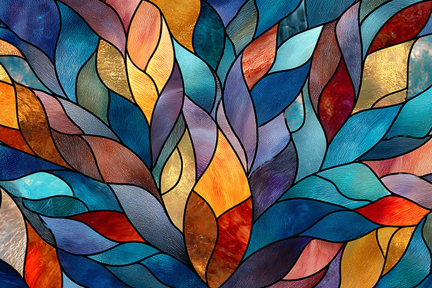This image features a stunning stained glass artwork composed of colorful leaves in various shades of blue, red, yellow, orange, and purple. The abstract design showcases a mix of modern and contemporary artistic styles, creating a visually striking and decorative piece.