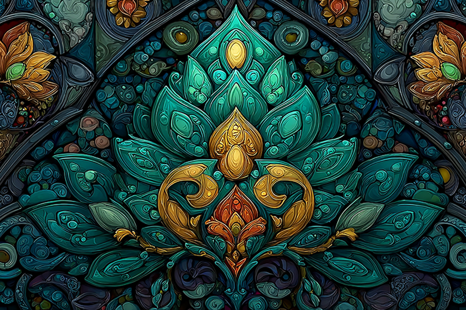 This stunning stained glass piece showcases a beautiful floral design with intricate details and vibrant colors. The artwork features a mix of teal, gold, orange, blue, and green hues, creating a visually striking effect. The symmetrical pattern and ornate shapes add to the overall beauty of the piece.