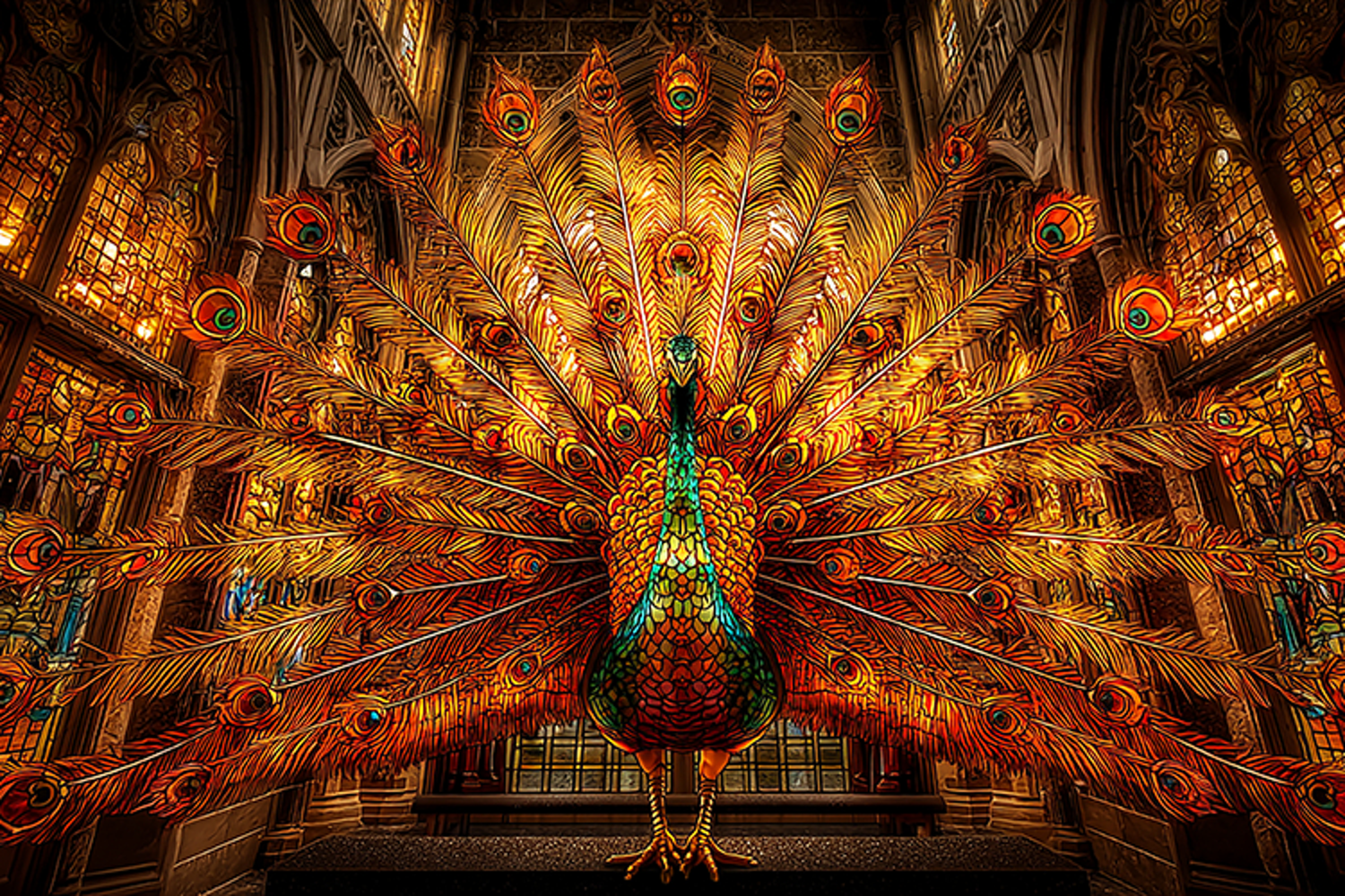 A stunning peacock stands proudly in a grand hall, its vibrant feathers spread wide, showcasing its breathtaking plumage. The ornate architecture and stained glass windows add to the luxurious atmosphere, creating a sense of drama and serenity.