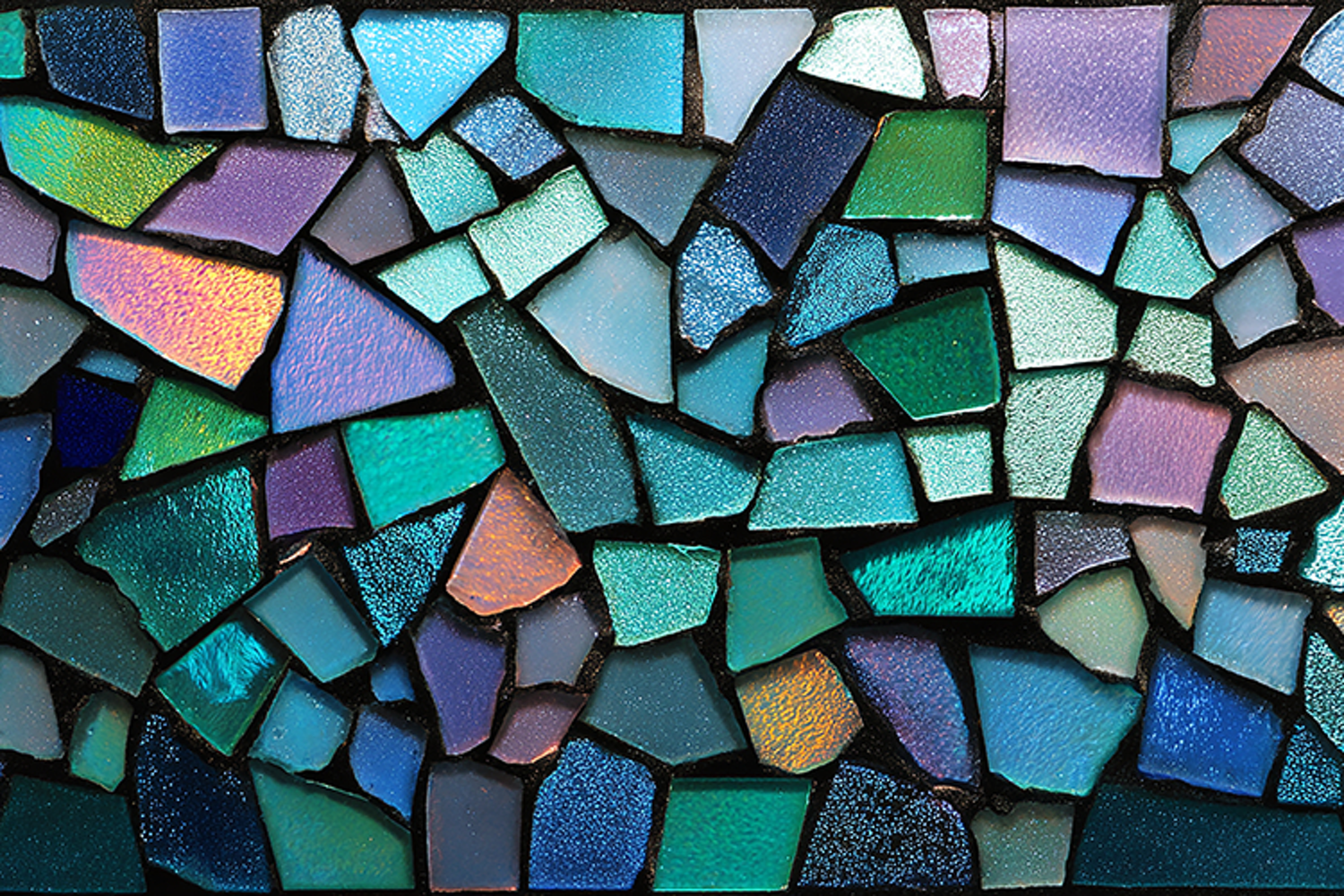 A vibrant mosaic artwork composed of numerous stained glass pieces in various colors, shapes, and sizes, arranged in a unique and creative pattern, showcasing a beautiful blend of hues and textures.